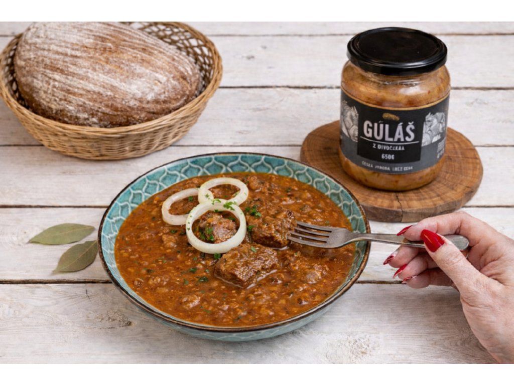Složení: Hovězí vývar (z hovězího masa a kostí), maso z divočáka 34%, cibule, pitná voda, vepřové sádlo, rajský protlak, hladká mouka, koření (česnek, kmín, majoránka, pepř, červená paprika, sůl)