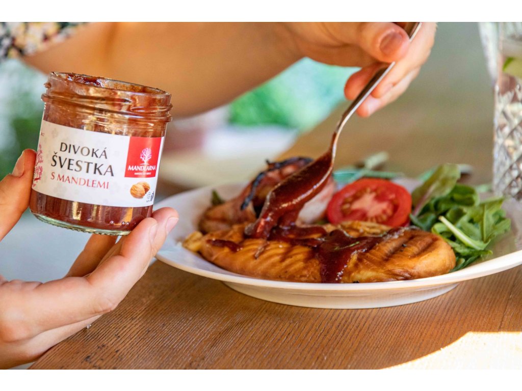 Složení: Švestky (75 %), cukr, vinný ocet, plátky mandlí (3 g), želírující látka pektin, česnek, mandlové aroma, zázvor, nové koření, sůl, chilli. Na 100 g hotového výrobku bylo použito minimálně 85g ovoce. Ve 100 g výrobku je obsaženo minimálně 57 g přírodních sladidel.