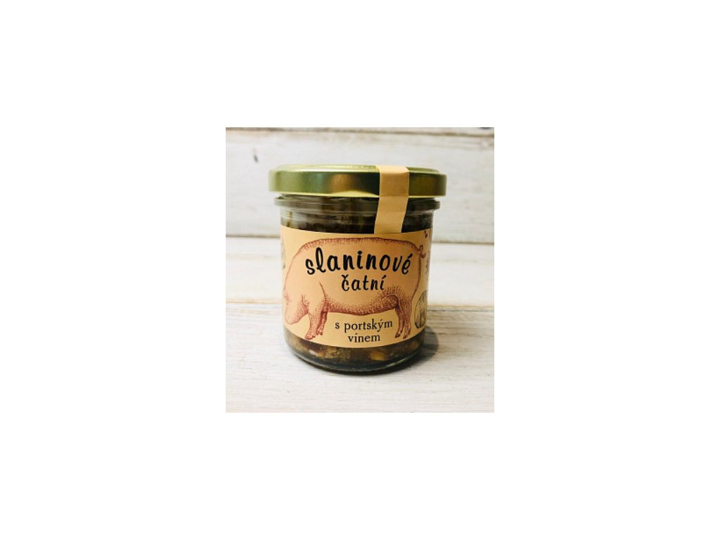 Složení: cibule 50%, uzený vepčový bok 25%, cukr, portské víno, jablečný ocet, česnek, sůl.