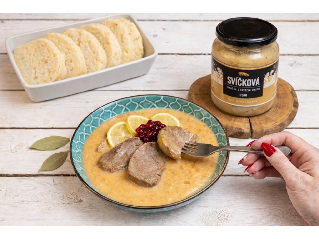 Když chcete rychle uvařit, ale nechcete slevit z chuti. Svíčková omáčka s hovězím masem je připravená podle poctivého receptu z kvalitního hovězího, kořenové zeleniny a smetany.
