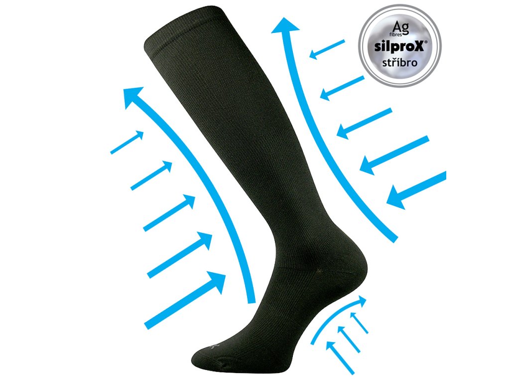Kompresivní podkolenky se speciální konstrukcí pro Vaše zdraví. Pozitivně působí na krevní oběh díky stupňovitému masážnímu tlaku. Jsou zejména vhodné tam, kde dochází k přílišnému zatížení dolních končetin. Antibakteriální ochrana materiálem silproX s ionty stříbra. U zátěžového sportu, rychlá regenerace svalů, zvýšení průtoku krve, větší okysličení svalů. Vhodné pro dlouhodobé stání, nebo sezení v zaměstnání, dlouhodobé cestování v různých dopravních prostředcích. Prevence proti křečovým žilám - vhodné pro budoucí maminky a zejména vhodné pro použití ve zdravotnictví. Odborný posudek: kompresní třída 1, měřené oblasti: chodidlová část - 13 mm/Hs, kotníková část - 13 mm/Hs, vyšší kotníková část - 11 mm/Hs, horní část lýtka - 8 mm/Hs, teplotní třída: A