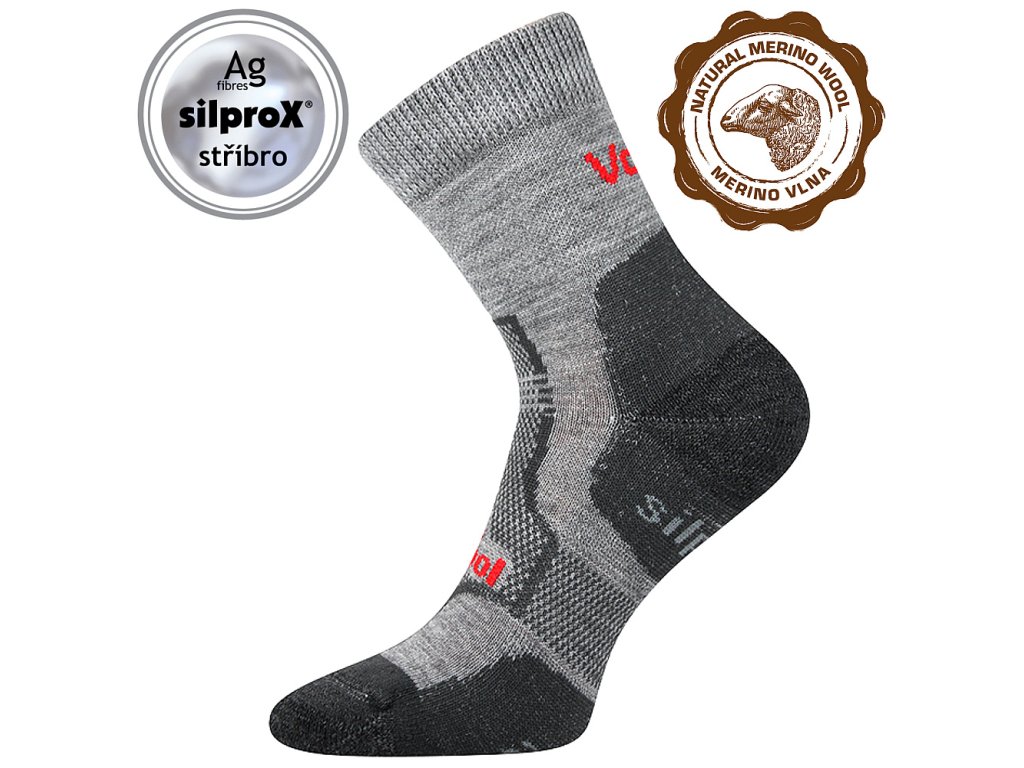 Dámské-pánské odolné a funkční ponožky, ideální pro treking a turistiku, jemný svěr lemu nestahuje lýtkovou část, froté úplet a zesílené polstrované chodidlo zaručuje pohodlí při nošení a maximální výdrž ponožek proti opotřebování, použité materiály merino vlna a silproX® s ionty stříbra zaručuje antibakteriální ochranu, v teplotní třídě C (-20°C až + 5°C)